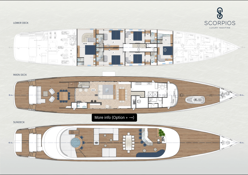 No expense has been spared in this stunning custom-built. From her distinctive silhouette to the materials beneath your feet, everything is a perfect blend of classic refinement and contemporary style. Whether you're hosting a cocktail hour on the upper deck, enjoying a private moment on the sea-level balcony, or working out with an ocean view, Scorpios feels like a floating boutique hotel—only better.